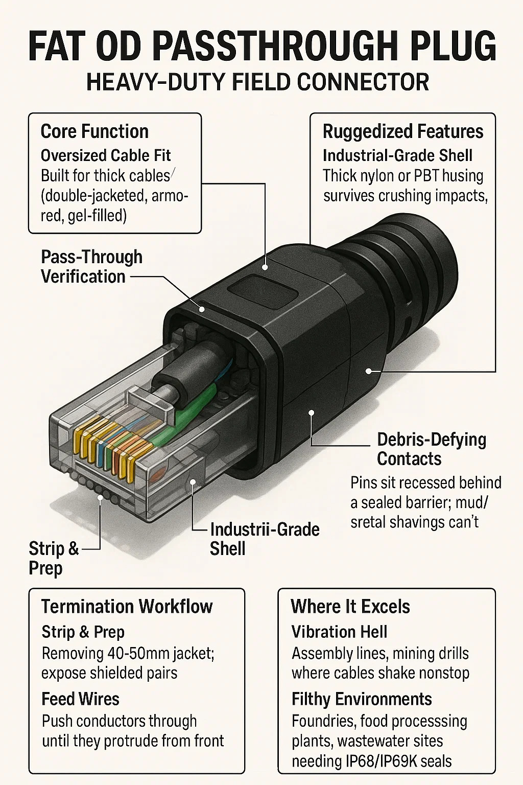 Oversized kabelpasvorm: Gebouwd voor dikke kabels (dubbel omhuld, gepantserd, met gel gevuld) die niet op standaardstekkers passen.