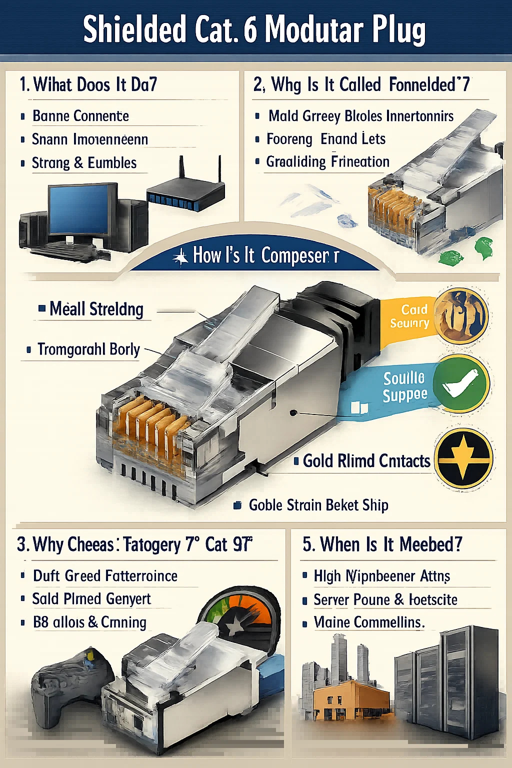 Dit afgeschermde Cat.6 modulaire stekker Simpel gezegd is dit een netwerkkabelconnector met een 'beschermend schild'. Als je netwerkkabelconnectoren met een glanzende metalen behuizing hebt gezien, dan is dat alles.