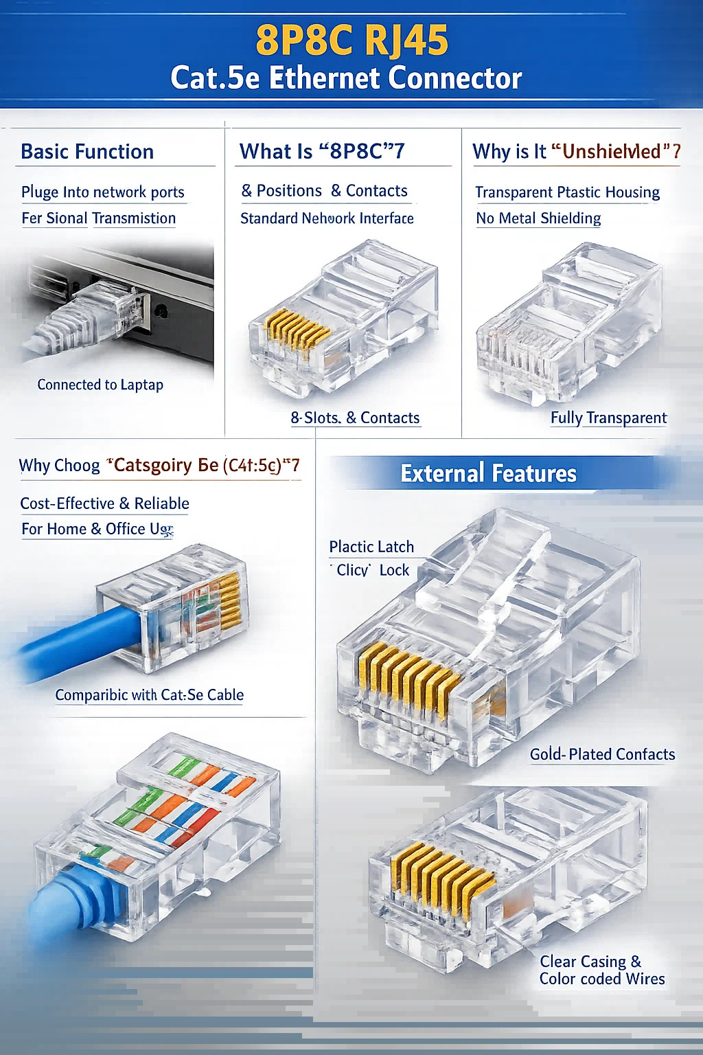 Dit onafgeschermde 8P8C Cat.5e modulaire stekker is eigenlijk het meest voorkomende type "RJ45-connector" dat in veel breedbandthuisnetwerken wordt aangetroffen, zowel in het verleden als in het heden. Het is transparant, compact en een fundamenteel onderdeel voor verbinding met een netwerk.